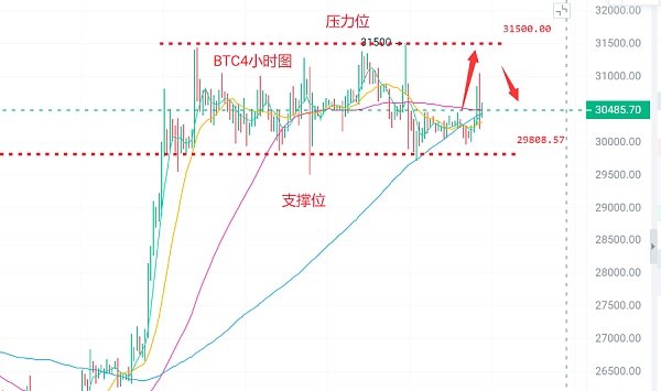 日线级别昨日收出锤子线,布林带处在收敛口中,MACD出现背离,4小时级别布林带平行运行,受布林上轨30600压制。操作上建议回踩29800附近轻仓做多,目标30600-31400,上攻31500不破轻仓做空,目标30800-30000,止损各350点。行情变化万千,具体操作以实时策略为主。