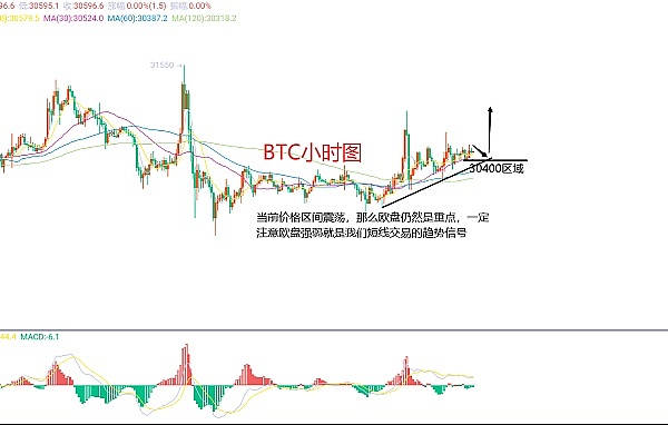 7月12日比特币(BTC)合约技术面分析:今日方面,大周期日线级别昨日报收小阳线,短时间上K线形态再次形成连阳走势,价格运行于均线上方,附图指标空头缩量运行,而价格持续维持在区间31500-30000内震荡,那么多空都没有很明显的趋势出现,所以方向的破位就是关键了;短周期小时图整体来看价格震荡上行,回撤没有力度且低点在上移,虽说短时间没有延续破高,但是要价还是明显的,这样来看的话后市价格破高反而会有动力出现,因此今日BTC短线合约交易策略:回撤30400-30500区域多,止损30250区域,目标看31000-31200区域;