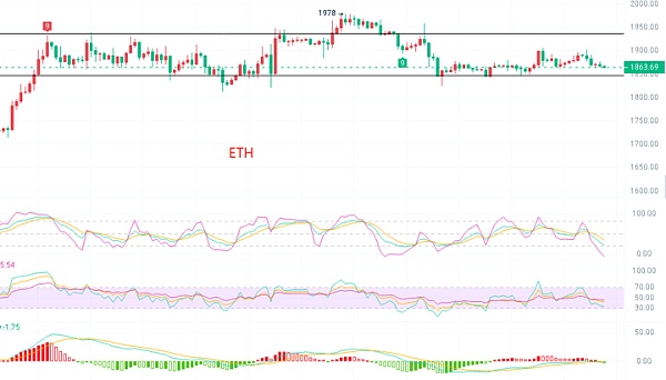 最近的以太一直表现的比较弱势在1830-1900之间震荡了快一个礼拜多了,目前还是主要还是看大饼的走势运行,大饼维持区间震荡也有些许时日了,日线上属于BOLL下轨的位置中运行,KDJ死叉向下散发,但是目前已经属于合拢状态,即将形成金叉,均线上5日均线往下穿插10日均线价格在13-34日均线中运行,价格参考1835-1893区间,波动都不大,耐心等待向上突破。