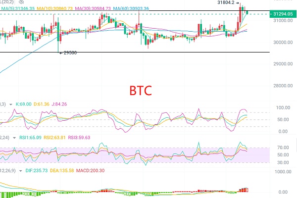 日线可以看到,目前的K线与下方MA5主K线还是存有一定的缺口在这里,短线均线有背离的迹象,那么行情目前的行情,虽说继续看涨,但是短线必须要走一轮回撤,或者说在目前行情震荡的位置来回盘整筑底,等待下方的支撑上移以后,再来打开后续的区间,对于日内还是整体趋向于盘整筑底,下方支撑可以回撤就考虑在日线的MA5附近的位置,再来考虑反弹,而四小时的走势也是一样,短线目前下方主K线与MA5还有MA10之间都是存在一定的缺口,对于后续的行情,要想继续突破,就必须要将目前的缺口进行补齐以后,再来继续走后续的拉升,所以说日内的行情,在继续上涨,还是有一定的难度,如果直接拉升上去,只能是涨的越高,跌得越多,而对于稳健操作,可以等待回撤下方支撑在三万点这位置,再来继续考虑反弹上涨。
