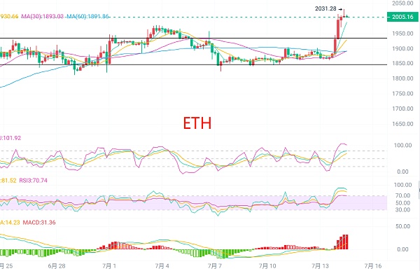 加密货币在昨日凌晨迎来一次狂欢,今日凌晨比特币一度达到 31830 美元,24 小时涨逾 3.53%,以太坊则盘中突破 2000 美元,触及了 5 月 6 日的前高点,24 小时最高涨幅超 8%,瑞波币涨幅更是高达惊人的73.1%。