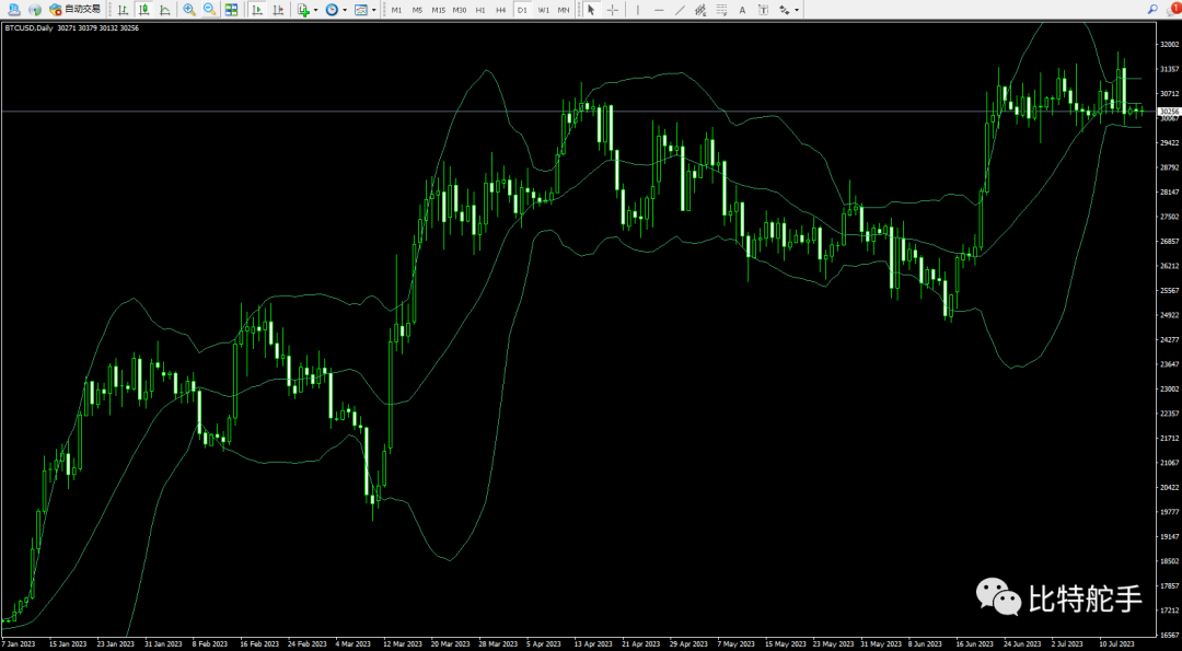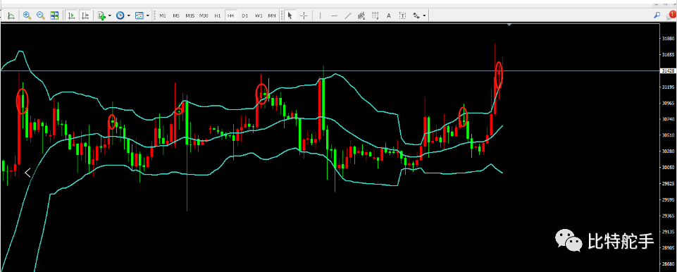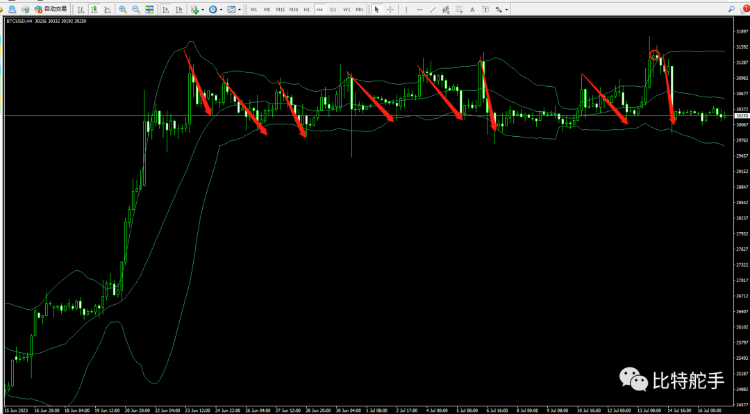 图一为上周我们在高点盘中实时空,文章实时提示空价格之后,给大家的图。历史总是在重复,图二是此刻的4小时图表。整个7月,每一次触及上轨30800之上31200之上 都有回踩布林带下轨。每一次都是如此。周五的冲高刷新高点之后仍然没有能够直接走强。这都在我们的预期之中。近期市场流动性持续不足,市场没有其他重大的数据刺激的情况下,很难有直接的突破走强。