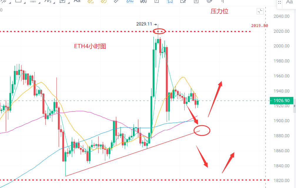 以太坊昨日高点1943附近,低点1914附近,以太继续联动大饼为主,目前在1930一带反复,短线仍处于上升趋势中。