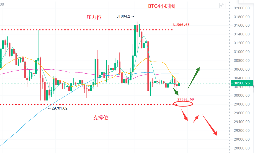 周线级别收出倒锤线,目前已经在高位盘整三周了,整体依然处于上升趋势中,布林带朝上运行,受布林上轨32300压制,日线级别昨日收出小阴线,布林带仍处在收敛口中,4小时级别布林带平行运行,受布林中轨30600压制。操作上建议回踩29800附近轻仓做多,目标30300-30800,上攻31500不破轻仓做空,目标30800-30000,止损各350点。行情变化万千,具体操作以实时策略为主。