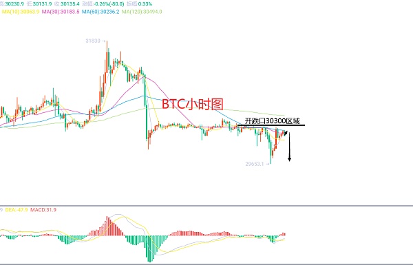 7月18日比特币(BTC)合约技术面分析:今日方面,大周期日线级别昨日报收小阴线,K线形态上连阴回撤,附图指标快慢线粘合死叉向下,但收线是探底回升的形态,所以今日还是要关注昨日低点的破位情况,反抽还是有可能出现的;短周期小时图前一日欧盘价格承压回撤破位前一日低点,开跌口位置在30300区域,低点支撑位置在29650区域,那么这就是今日要关注的区间高低点了,而当前,价格在凌晨探底后支撑反弹,如果今日要看延续,反抽就不能破开跌口位置,否则难跌;因此今日BTC短线合约交易策略:现价可以先空,止损放在30350区域,目标看29500-29400区域;另外再强调一遍,欧盘强弱还是关键,如果欧盘价格反抽破开跌口,那么再做调整。