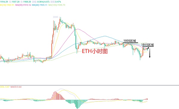 7月18日以太坊(ETH)合约技术面分析:今日方面,大周期日线级别昨日报收小阴线,K线形态上连阴,附图指标死叉向下,而昨日价格回撤后早间支撑反弹,低点支撑位置还是在1860区域,高点阻力位置1935区域也是昨日的开跌口位置;短周期小时图K线形态连阳,附图指标金叉向上,但是也是一样的,今日如果看延续下跌破低的话,那么反抽不能破昨日开跌口位置,否则难跌,所以这样欧盘依然是重点,两个准备,第一:价格反抽1915区域空,止损1935区域,目标看1880-1860区域;第二:欧盘价格反抽破1935区域,美盘回撤再去尝试多;