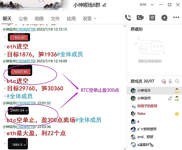 恭喜,行情再次暴跌,小神也是顺势拿下空单利润,btc在30057布局的空单,完美到达止盈目标29760,止盈300个点,eth也是在1906布局的空单,最大盈利22个点,如图,实盘裙布局情况: