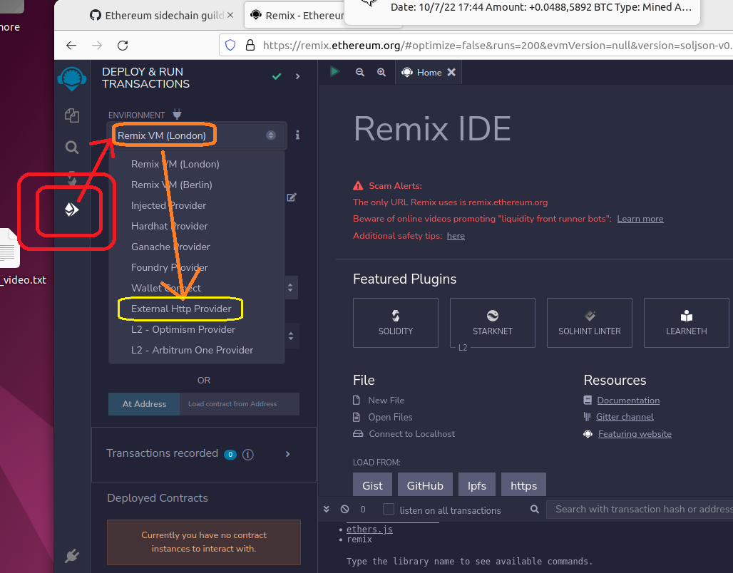 现在入侵更广阔的ETH世界 https://remix.ethereum.org/。像绵羊中的狼一样,点击侧边栏的ETH标志,然后将 “Remix VM (London)” 更改为“External Http Provider”。