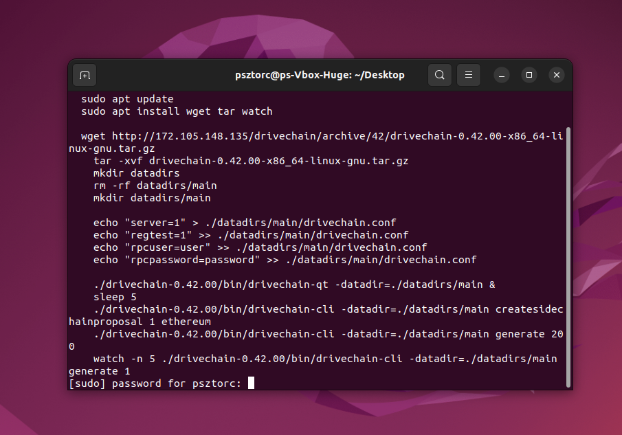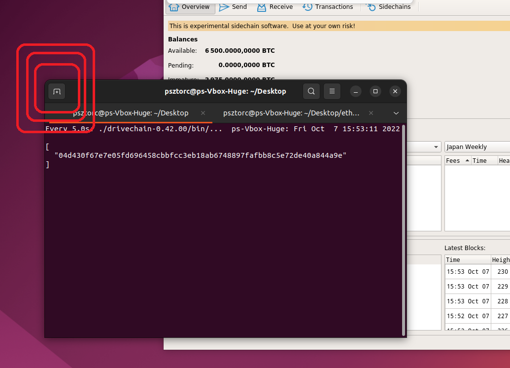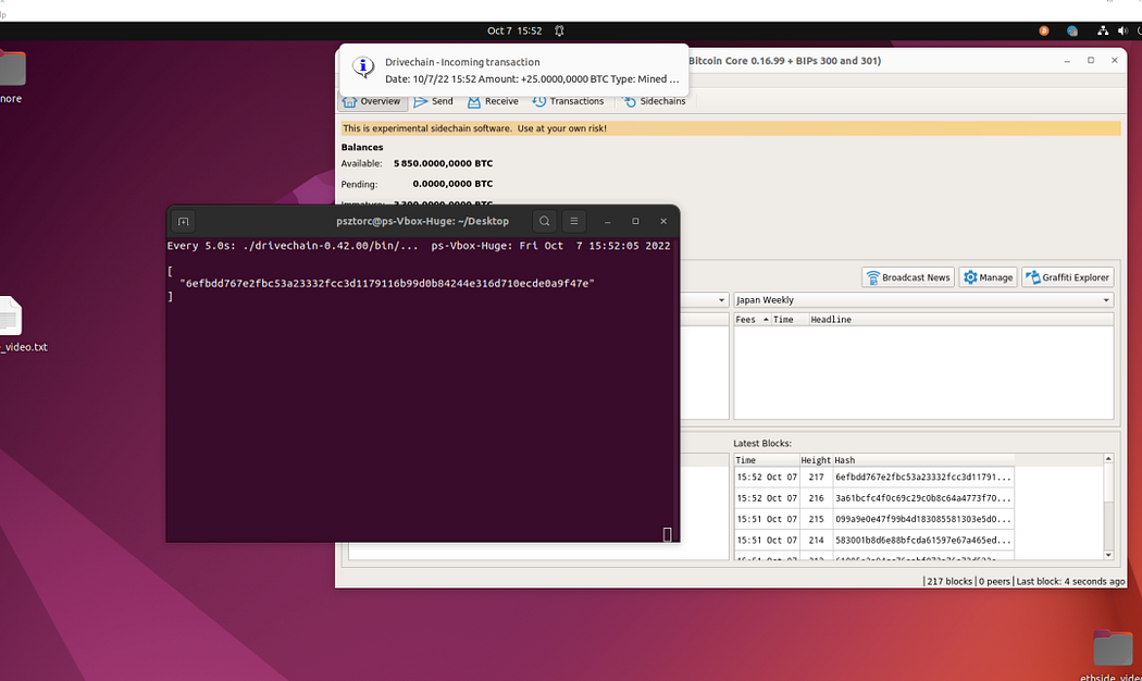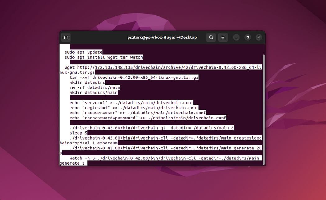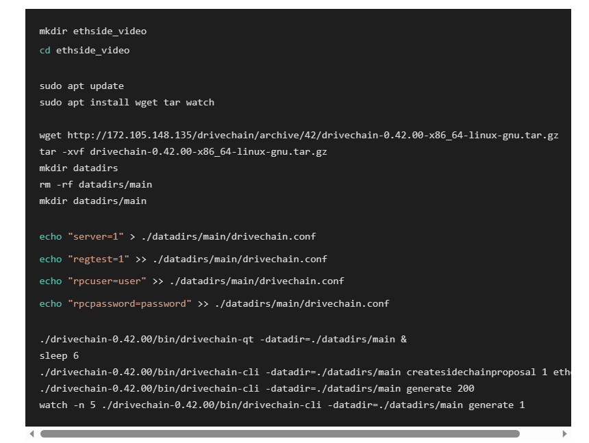 现在我们想做一堆步骤:创建一个项目文件夹,执行更新和安装依赖项,下载DriveNet-42,为其区块链创建一个特殊目录(在项目文件夹内,它不会打扰您的任何其他文件),打开DriveNet(在正则表达式模式下,这样我们就可以不受工作量证明的阻碍地进行测试),提出并激活以太坊侧链(在侧链插槽#1中),最后命令正则表达式区块链每5秒找到一个块。在终端中,运行以下操作(复制/粘贴,使用[ctrl+c],[ctrl+shift+v]: