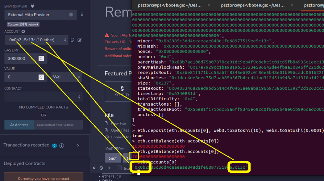 该命令将从主链中获取10个BTC(因为您一直在挖矿),并将它们发送到ETH侧链。(硬币的可分割性在ETH世界是不同的,所以你得到的不是10,000,0000“sats”,而是10000000000000000000又名1000京单位10,000,0000,00,000,0000的“sid-gwei”(有点像sats-squared)。以太坊不是很有趣吗!?) (当硬币被送回主链时,它们将返回到原始的“sat”级别的可分割性。)