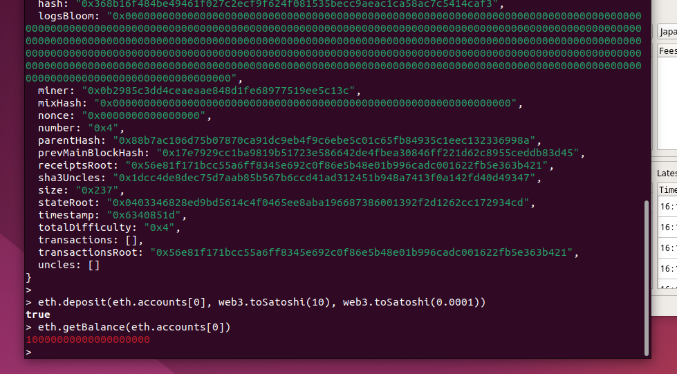 eth.deposit(eth.accounts[0], web3.toSatoshi(10), web3.toSatoshi(0.0001)) eth.getBalance(eth.accounts[0])