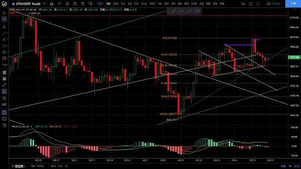 以太坊昨日走势和大饼一致整体呈震荡下行,低位跌至1876一线支撑反弹,恭喜跟上昨日思路的朋友,目前币价在1908附近运行,四小时级别行情二次下探趋势线支撑且未破前低走出收针反弹,上方再次触及1920区域压制未能突破,macd空头缩量双线粘合有金叉迹象,ma7均线拐头向上,虽有反弹迹象但力度减弱预计空间不会太大,日线来看行情来回震荡,多空转换频繁,整体处于1870-1920小区间震荡, 未破前可以高空低多操作,上方压制1920-1950,下方支撑1870-1830