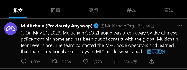 7 月 14 日,Multichain 发推称,其 CEO Zhaojun 于 5 月 21 日在家中被警方带走,此后与 Multichain 全球团队失去联系。团队联系了 MPC 节点运营商,得知其 MPC 节点服务器操作访问密钥已被撤销。