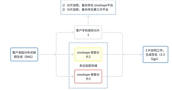 首先,Sinohope 采用 3-3 多方签名方案(也支持 t-n 阈值签名设置),其中 2 片由平台协管,通过高强度安全加密 + 可信执行环境确保安全,三方共同参与才能完成交易签名,避免用户的单点风险。