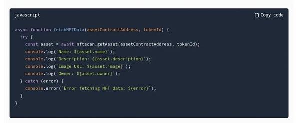这个函数以 assetContractAddress 和 tokenId 作为参数,并从 NFTScan API 获取相应的 NFT 数据,然后函数将 NFT 的名称、描述、图片 URL 和所有者地址记录到控制台中。