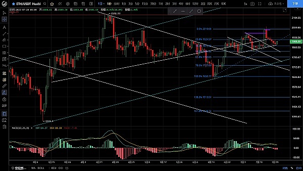 以太坊昨日晚间向上插针至1924一线受阻回落,随后行情震荡下行,低位跌至1882一线支撑反弹,恭喜跟上昨日思路的朋友空单获利40点,目前币价在1905附近运行,四小时级别行情整体呈震荡走势,上方关注1920附近,下方关注1870区域,短期走势来看回踩底部逐渐抬高,macd空头转多双线粘合,多空走势来回拉锯,短期很难走出单边,日线级别如图所示趋势线支撑未能破位,且底部抬高,短期走势有向上反弹的需求,若无法站稳1920上方则会继续震荡,思路建议区间未破前高空低多对待破位持有,上方压制1920-1950,下方支撑1880-1850