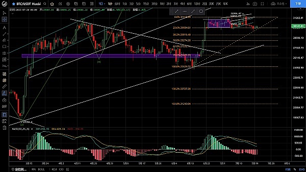 大饼整体波动不大,昨日最高触及30192附近一线受阻回落,低位跌至29758附近支撑反弹,目前币价在30112附近运行,四小时级别底部逐渐抬高,macd多头运行双线金叉向上,整体走势虽偏向多头但反弹力度薄弱,上方ma30均线压制未站稳前无法继续上行,短期走势震荡为主,日线来看29500支撑未破,k线收阳继续上行,空头走势减弱,整体呈区间震荡持续性不强,思路建议高空低多对待,上方压制30200-30500,下方支撑29800-29500