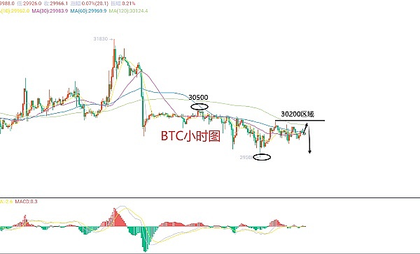 7月20日比特币(BTC)合约技术面分析:今日方面,大周期日线级别昨日报收小阳线,K线形态上连阴单阳,价格运行于均线下方,附图指标死叉向下,但是要注意,如果价格延续震荡区间走势,那么空头动能会有消耗,之后还是有反抽的概率,且价格一直都是在高位盘整的;短周期小时图昨日的价格爆发时间也是集中在美盘和凌晨以后,美盘冲高快速承压回撤,震荡后凌晨回撤但依旧没有破地点,所以今日我们在看延续下跌破位的同时,交易先保持区间;因此今日BTC短线合约交易策略:反抽30200区域空,止损30500区域,目标看29600-29500区域;
