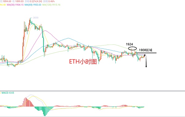 7月20日以太坊(ETH)合约技术面分析:今日方面,大周期日线级别昨日报收小阴线,K线形态上连阴,价格运行在均线下方,附图指标死叉向下,走势还算平稳,但是还是之前的问题,缺少的是延续性和爆发力度,这也是最近的行情的整体走势,还是要先关注破位情况;短周期小时图下跌时间还是在凌晨,而开跌口位置在1915区域,低点位置在1880区域,这是我们今日先要关注的位置,当前K线形态连阳,所以日内还是有反抽的,因此今日ETH短线合约交易策略:反抽1905-1908区域空,止损1924区域,目标看1880-1860区域;