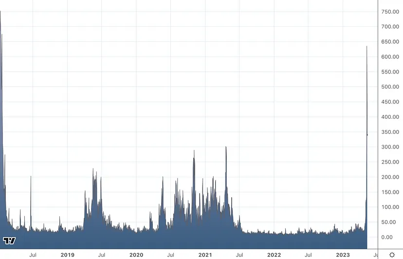 链上数据显示,伴随着BRC20的爆火,从5 月 1 日开始,BTC 每笔平均交易费用开始出现大幅增长,从初期的 2U 上涨到现最高峰的 20多U。