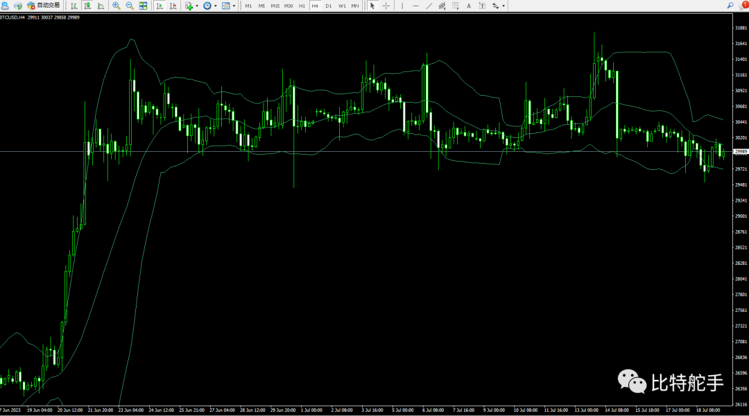 如图四小时,价格一直延续在布林带中下轨运行。整体走势依然是偏弱势的。昨日探底29450之后反弹再次回到了前期持续横盘的布林带下轨支撑30000附近。目前价格仍然在整数关口徘徊。