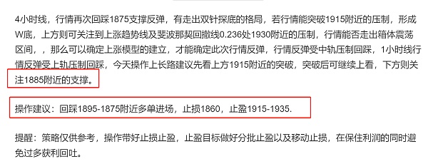 4小时线,行情再次回踩下方颈线位置1885附近的支撑反弹,并未走出箱体震荡区间反弹,今天可以先关注到1905附近的压制,若能顺利站稳,那么将有机会去冲击1915及上方上涨趋势线1935附近的机会。4小时行情连续三次测试下方低点获得支撑反弹,有走出三针探底的态势,若能顺利突破上方压制,那么则可关注到上一个密集交易区间的压制,可在压制位附近考虑进场防守空单,具体策略将实时给出。今天操作上长路建议先看反弹,昨天给出的多单策略进场的朋友的继续持有,无法突破上方压制再空单进场。