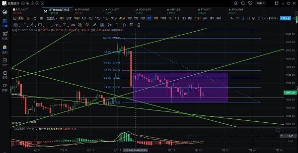 以太坊行情分析:昨天行情收长上引线阴柱,插针1924附近承压回落,再次跌至颈线位置1885附近获得支撑反弹,行情连续三次回踩,长路昨天也在视频中给出了行情有可能走出三针探底的局势,而上方受日线中轨的压制,并未做出突破,今天可以先关注日线中轨1905一线的突破,若是能站稳,那么三针探底才算形成,下方有多单的朋友可分批止盈。下方则需要关注到1885-1865附近的支撑。