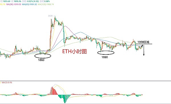 7月21日以太坊(ETH)合约技术面分析:今日方面,大周期日线级别昨日报收小阳线且带有长上影线,走势上还是冲高回落这也是最近的走势规律,价格依然处于高位盘整区间震荡,K线形态连阴缺少力度和延续,附图指标死叉向下运行;短周期小时图昨日欧盘价格上涨破高,美盘承压回撤,但还是没有向下破位,低点支撑1880-1860区域是需要关注的,而当前K线形态连阳,附图指标金叉向上所以日内是有反抽的,那如果今日看延续回撤破低,反抽力度不能,因此今日ETH短线合约交易策略:反抽1908-1910区域空,止损1931区域,目标看1880-1860区域
