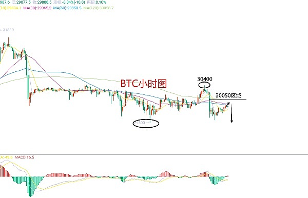 7月21日比特币(BTC)合约技术面分析:今日方面,大周期日线级别昨日报收小阴线,还是重复昨日的故事,价格冲高回落,K线形态上连阴下跌,价格震荡下跌,附图指标死叉向下,缺少的就是延续和力度了,所以在没有破位前,保持区间就好;短周期小时图前一日价格欧盘上涨破高吴延续,美盘承压下跌凌晨支撑反弹当前震荡上行,附图指标金叉,那么日内还是在要价的,昨日开跌口位置在30400区域,今日要看延续反抽力度不能大以及不能破开跌口位置,否则难跌;因此今日BTC短线合约交易策略:反抽30000-30050区域空,止损30250区域,目标看29600-29500区域;