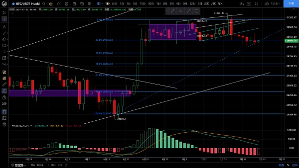 大盘昨日走出冲高回落走势,高位触及30421一线受阻迅速回落,低位跌至29600一线,恭喜跟上昨日思路的朋友空单获利800点,目前币价在29900附近运行,四小时级别行情画门再次下跌至29600附近,未破前期低点暂时空头止跌,走出反弹k线连阳,macd多头无量运行双线粘合走平,上方阻力较强预计突破的概率不大,日线级别虽整体仍是区间震荡,但走势偏向空头,下行跌破的可能性较大,思路建议反弹30000上方进空为主低多为辅,上方压制30000-30300,下方支撑29500-29000