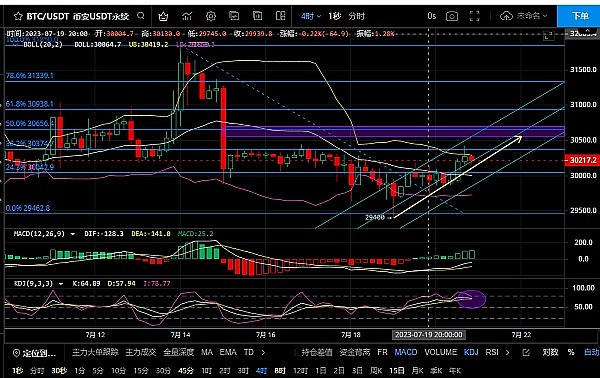 比特币昨日k线收小阳继续上行,空头缩量。今日整体波动不大,早间回调29800一线企稳反弹,晚间高点触及30411一线。当前,四小时BOLL指数运行在上轨附近,底部逐渐抬高,MACD绿色空心动能柱放量运行,双线呈现金叉向上态势。从技术指标分析,短期整体走势偏向多头,建议回调低多为主。