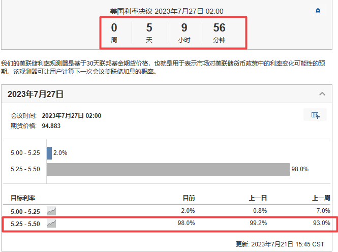 7.27凌晨两点的加息概率目前到了98%,基本上是板上钉钉了,很确定的事情了,这也是近期市场被空头压着探底的原因;