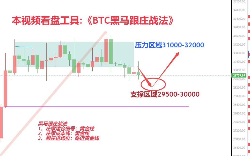 预判的走势来看,要么是在第一个抄底区域29500-30000这里探探底,后面直接拉上去,要么再急跌一波跌到28000附近,后面再拉起来;