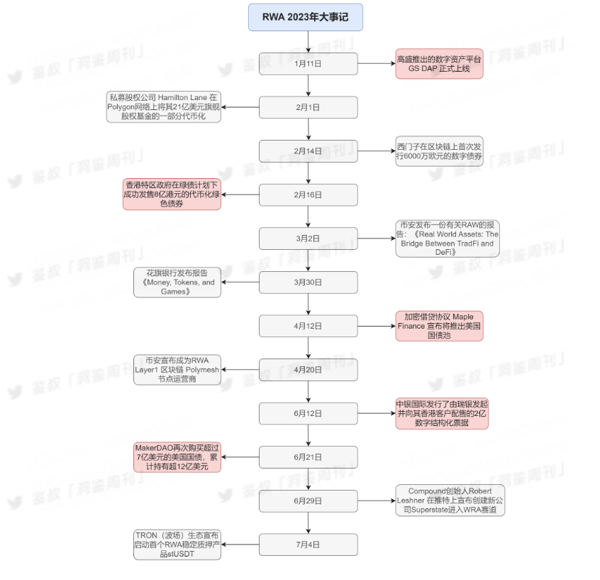 头部稳定币借贷协议 MakerDAO 在 2020 年就发布了 RWA 相关计划,Aave 在 2021 年也宣布进入 RWA 市场,不过在 2022 年的深熊期间,RWA 渐渐无人问津。解析 RWA 再引关注的原因,我们得先看看 RWA 赛道今年以来发生了哪些大事。