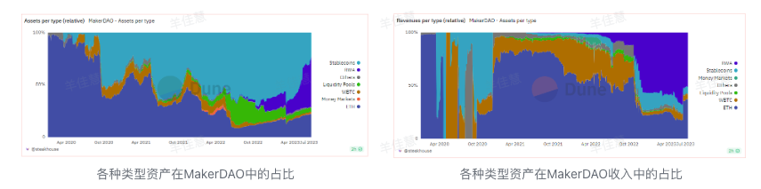 根据 Dune 数据显示,截止目前 MakerDAO 总资产中的 48% 是 RWA,同时有超过 50% 的收入来自于 RWA。MakerDAO 正在从一个传统的 DeFi 协议转向侧重于 RWA 的新方向。