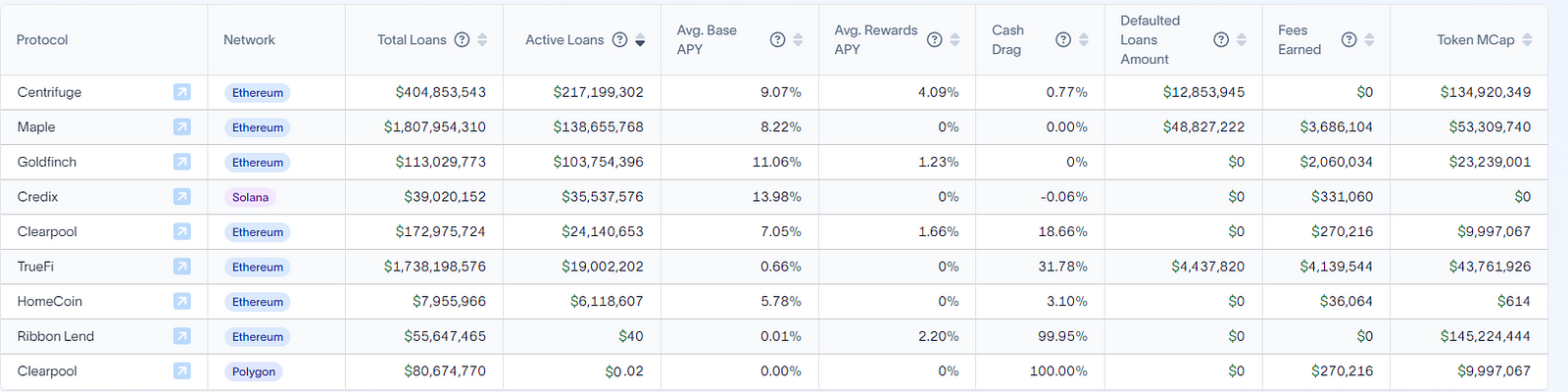因为 RWA 赛道的抵押品或者交易资产是链下的,也不是传统 DeFi 协议中的 ERC-20 代币,因此当发生资产清算事件时要比原生加密资产清算复杂得多。根据 rwa.xyz 的数据显示,目前主要的 RWA 协议中,Centrifuge、Maple、TrueFi 均出现了坏账,总违约金额达 6600 多万美元,贷款违约率为 1.6% 左右。