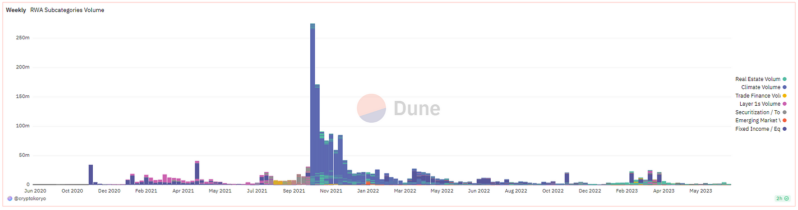 因为 RWA 并不是新概念,此轮 RWA 叙事不免有炒冷饭的嫌疑。根据 Dune 数据显示,目前 RWA 各类别交易量加起来远不及上一轮 2021 年时最高峰的交易量。2021 年 10 月左右 RWA 各类别周交易量加起来超过 2.5 亿美元,随后一直萎缩,到目前即使热度再次上升,周交易量也不足 5000 万美元。不禁令人发问,此轮 RWA 又要上演狼来了的故事的吗?
