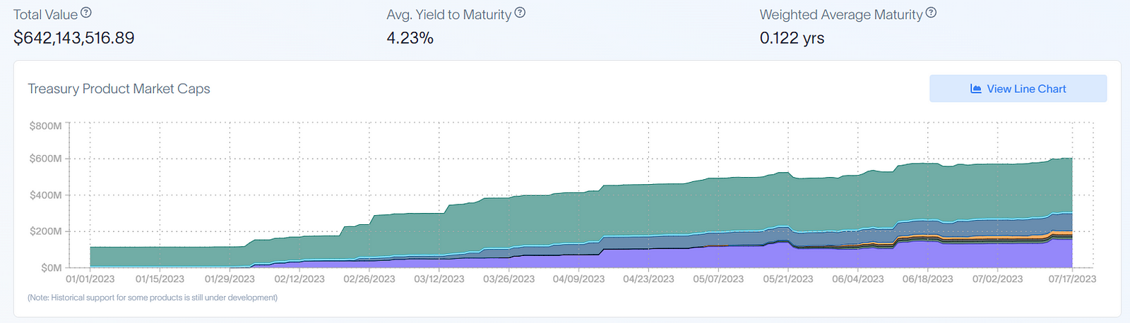 当前市场上的 DeFi 投资者相比于牛市时期追求高利率高收益,随着市场不确定的加剧,已经改变了投资策略,转而追求受加密市场影响较小的稳定收益,美债 5.3% 左右的无风险年化收益,已经足以让投资者们盯上链上美债的收益。根据 rwa.xyz 数据显示,截止 7 月 17 日链上美债的总价值约为 6 亿,加权平均收益率为 4.23%,加权平均期限小于一年。
