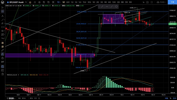 昨日大盘整体呈震荡上行走势,高位触及30064一线承压回落,低位跌至29766一线,恭喜跟上昨日思路的朋友空单获利300点,目前币价处于29900附近运行,四小时级别k线连阳有上攻需求但迅速插针收回,底部逐渐抬高,macd多头逐步放量双线金叉向上,短期走势偏向反弹关注能否突破30000上方,日线级别连续多次收线在30000下方,若能跌破29500会有一波瀑布,目前仍在区间震荡,预计将持续到美联储会议才能走出方向,个人更倾向于下跌,思路建议区间未破前高空低多对待破位持有,上方压制30200-30500,下方支撑29500-29000