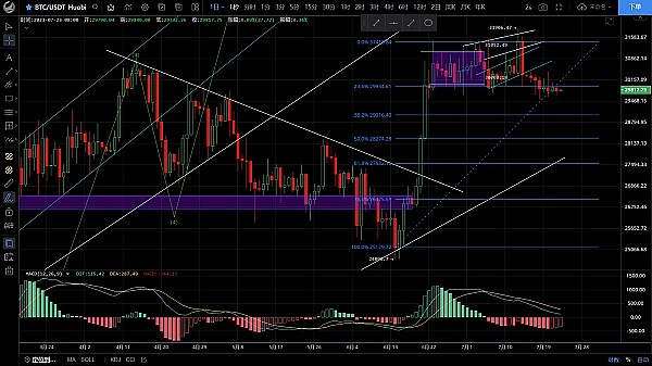 大饼昨日波动不大整体呈震荡下行走势,早间行情加速下跌至29623一线迅速反弹,恭喜跟上昨日思路的朋友,目前币价在29780附近运行,四小时级别行情再次下跌未破前低k线收下影走出反弹,macd多头无量运行双线粘合有金叉迹象,短期29500支撑有效预计会走出一波反弹,上方关注30000关口,没有突破将延续在区间震荡,日线级别整体没有任何变化,行情依旧处于区间震荡,k线连续多次收线在30000下方预计下行破位的概率较大,周末波动不大还是震荡,思路建议给机会可以反弹进空为主低多为辅,上方压制30000-30300,下方支撑29500-29000