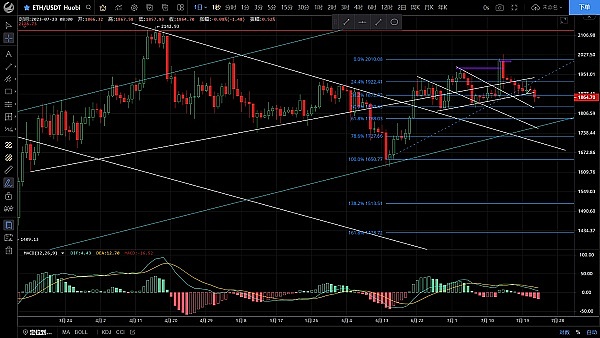 以太坊整体走势偏弱,昨日呈震荡下行走势,早间空头发力破位1870支撑迅速跌至1846一线收针反弹,恭喜跟上昨日思路的朋友,目前币价在1869附近运行,四小时级别行情整体处于ma14均线下方,k线收大阴虽收影线但有效跌破1870支撑,macd空头放量双线死叉状态,短期有反弹需求,预计空间不会太大,整体走势依旧空头占优,日线级别空头逐步放量双线死叉向下延伸,日线有效跌破斐波那契0.382支撑转为压力,ma7均线向下指引,下周预计会走下行,思路建议反弹高空为主低多为辅,上方压制1880-1910,下方支撑1850-1830