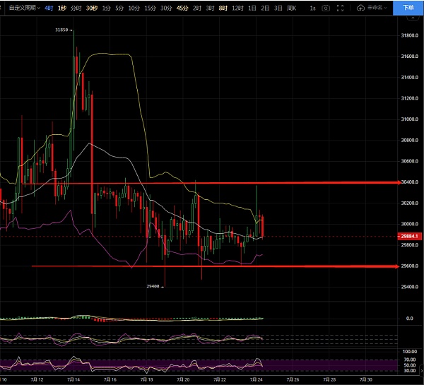 咱们4小时来看,布林带有明显开口上扬,K线经过长时间低位横盘蓄力,多次插针探底,K线已运中轨上方,MACD多头能量柱放量运行,从目前的盘面看行情上方承压回撤,陷入了下跌的局面,我们可以看到目前下方支撑则继续维持于29500一带,而在触及到29600附近获得支撑的同时,那么后期也将围绕于此位置进行多头操控,而日线虽然阴线回撤,但终究没有实质性的下破。上方压力短期维持于30000—500一线附近,如后续行情站稳此位置后可继续上行,那么多头仍有反抽的余地,延续近期内的多头能量突破上行的话,则上方的压力也将上移于31000一线附近位置。