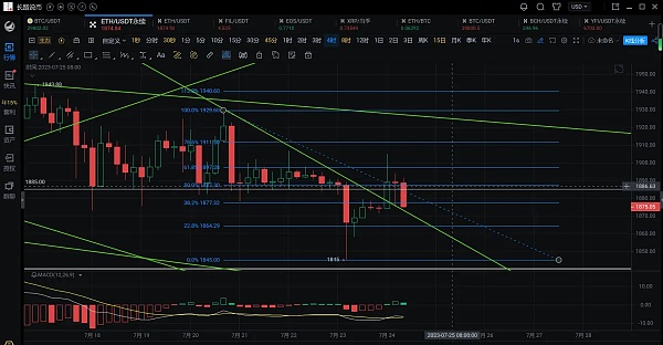 4小时线,昨天行情早间测试下方1845附近低点反弹,凌晨突破下跌趋势线的压制,冲击上方斐波那契0.618处1900附近高点并未站稳顺势下跌,现又跌至下跌趋势线附近,短期来看行情依旧偏空头,若是跌破下跌趋势线的支撑,那么需要去关注下方0.228处1864附近的支撑,若不跌破则可考虑进场防守多单,跌破则需关注颈线位置1845附近的支撑。今天操作上长路建议,先看空,不破下方支撑再考虑多单进场。