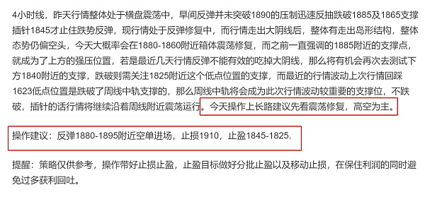 昨天长路在文中给出的先看行情反弹,可以如果在1895附近进场的朋友,可以移动止盈,先看1880是否能够跌破,跌破空单继续持有。