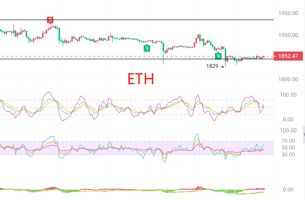 ETH昨日冲高失败再次回落,目前再次回到了下方的强支撑位1850附近,从4小时图可以看到,这次的1850是第三次试探,这个位置的关键性也显而易见,这里撑住了上方还有机会再次看1900,这里再次跌破的话,下方就要1800以下见了。所以短线到了支撑位还是一个做多的时机至少短线是做多的机会,一旦这里支撑柱上方的空间相当大ETH今日白盘围绕1840-1850区间入场多单,上方看压力1868的情况,下方止损看前低1828附近
