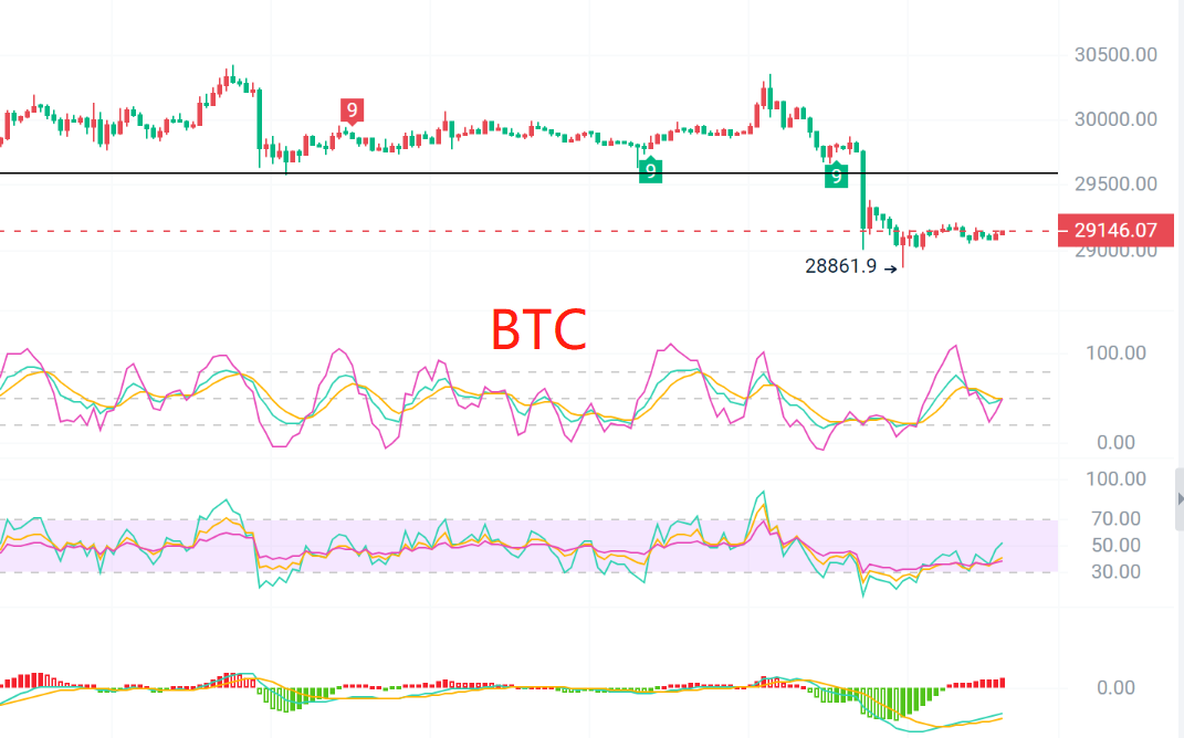 昨天下午跌破了29400美元箱体下沿,短线出现破位。下方面支撑位应该在28500美元附近,如果遇反弹不进29500美元,则可能,下探下一个强支撑27500-27800美元。短线可以高空为主,现货等调整结束的进场。币市的价格波动几乎都是来自于外部信息的推动,而币市本身并没有任何新的能带动价格上涨的叙述。上涨是反弹也非常有限,但如果情绪上出现崩盘,那么少亏总比深割肉强,应该是很多短期投资者的共鸣。