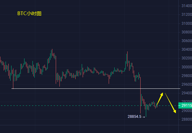 比特币,高位震荡了个多月之后,昨日最终迎来了下破,在这轮震荡周期当中,感受最明显的就是多头的乏力,每一次的破高必然伴随回调,完全没有延续性,即便日线大阳拉升第二日也照常大阴回吐,所以下破也不算意外;上周币价在30000关口下方连续回踩测试29500一线支撑之后,昨日破低下跌,短线跌破29000关口,日线通过大阴的形式破底部支撑,这种形态构成破位条件,短线上自然还是继续看跌,但是至于行情能够构成连续性,那还得看实际行情表现,毕竟这段时间的行情运行尤其在连续性这一块不够稳定,往往是走一波之后就开始漫长的震荡;技术面日线下一个支撑位刚好在昨日低点28800一线,此位置是前期的阻力转换位,日线若能延续跌破此位置的话,短线下看28000关口。