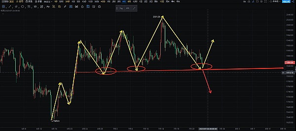 ETH昨日冲高失败再次回落,目前再次回到了下方的强支撑位1850附近,从4小时图可以看到,这次的1850是第三次试探,这个位置的关键性也显而易见,这里撑住了上方还有机会再次看1900,这里再次跌破的话,下方就要1800以下见了。