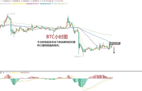 7月26日比特币(BTC)合约技术面分析:今日方面,大周期日线级别昨日报收小阳线,价格运行于均线下方,附图指标死叉向下,当前均线阻力位置在29500区域,这也是前期的低点,而当前心态我们要关注顶底转换的趋势,所以说昨日的反弹是修正,今日我们还是要看延续下跌的;短周期小时图在前期下跌破低后,价格维持了震荡横盘震荡,昨日美盘三次冲高都是承压回撤了且K线上都是带有长上影线的,这样来说反弹是没有力度的,因此今日BTC短线合约交易策略:现价29300区域直接空,止损放在29600区域,目标看28800-28600区域;