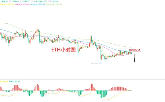 7月26日以太坊(ETH)合约技术面分析:今日方面,大周期日线级别昨日报收小阳线,K线形态连阴下跌,价格运行于均线下方,附图指标死叉向下,当前大趋势还是下跌走势比较明显的,而昨日的小阳反弹也是修正的表现,价格回归均线阻力位置在1875区域;短周期小时图持续的震荡低位横盘昨日美盘冲高均承压回撤,这样来看反弹是没有力度,而当前的横盘还是修正,所以今日欧盘我们继续看承压回撤破低,因此今日ETH短线合约交易策略:现价1858区域直接空,止损1871区域,目标看1820-1805区域